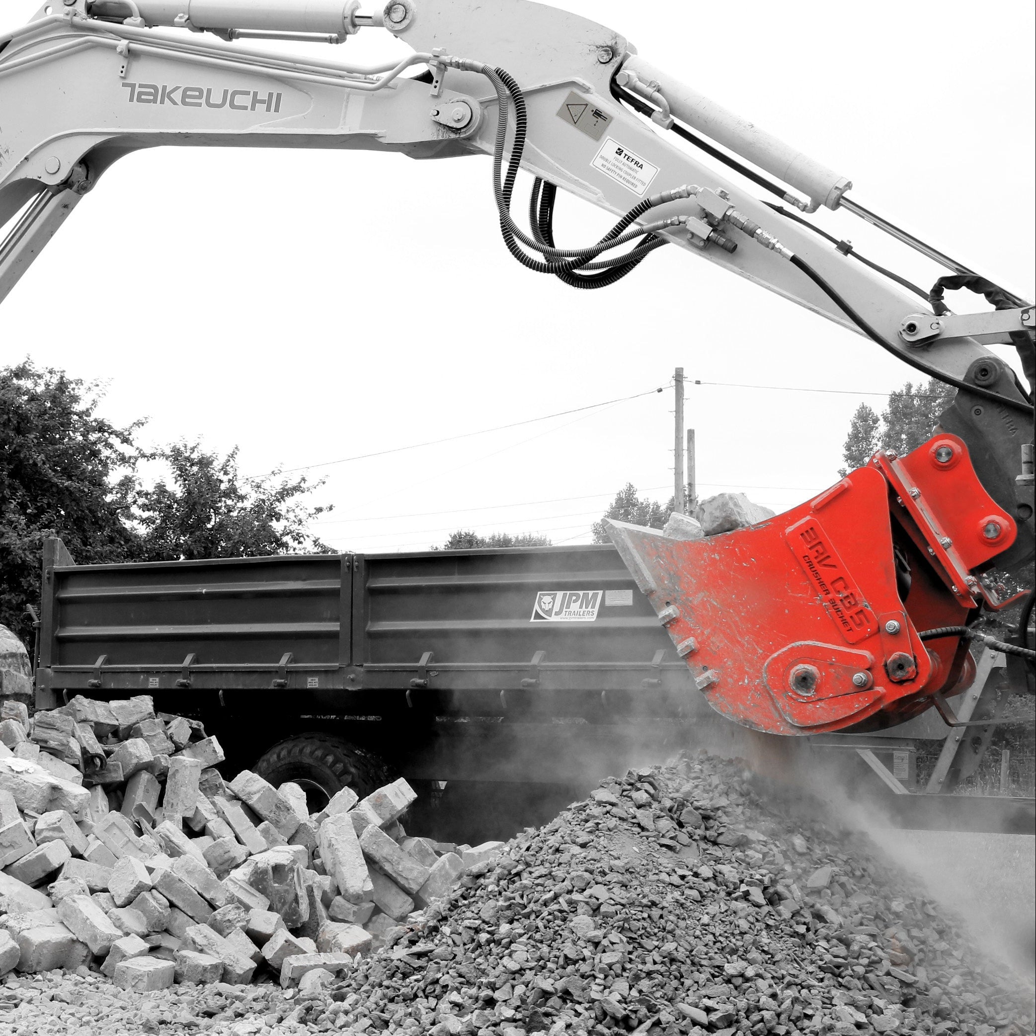 The powerful, low-frequency, high-force crushing action allows even the hardest concrete to be processed with ease and will even cope with rock. This crushing process is highly resistant to blockages - thereby minimising costly downtime - and enables use on the widest variety of materials. The design has no vulnerable parts or machinery on the bucket sides.